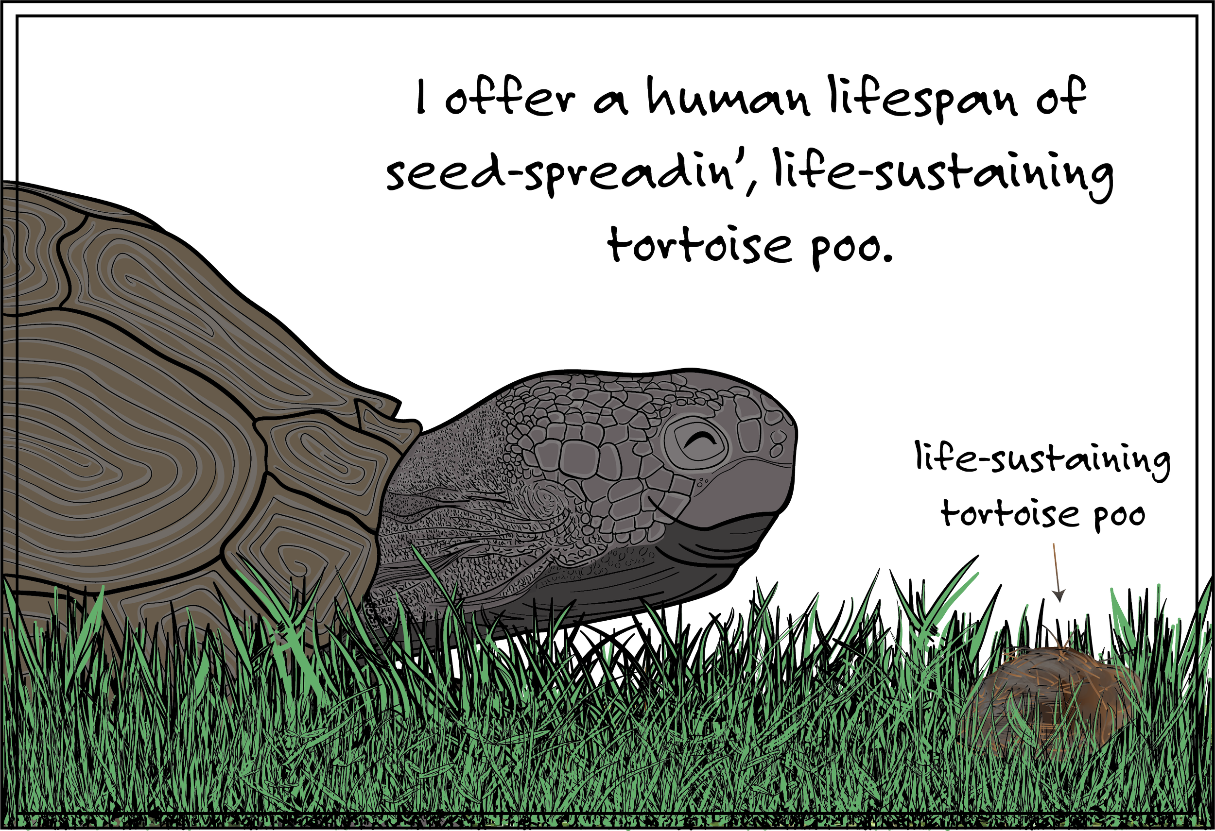 pooping out their seeds. Over their roughly human lifespan they help spread diversity and maintain healthy plant growth one poo at a time.