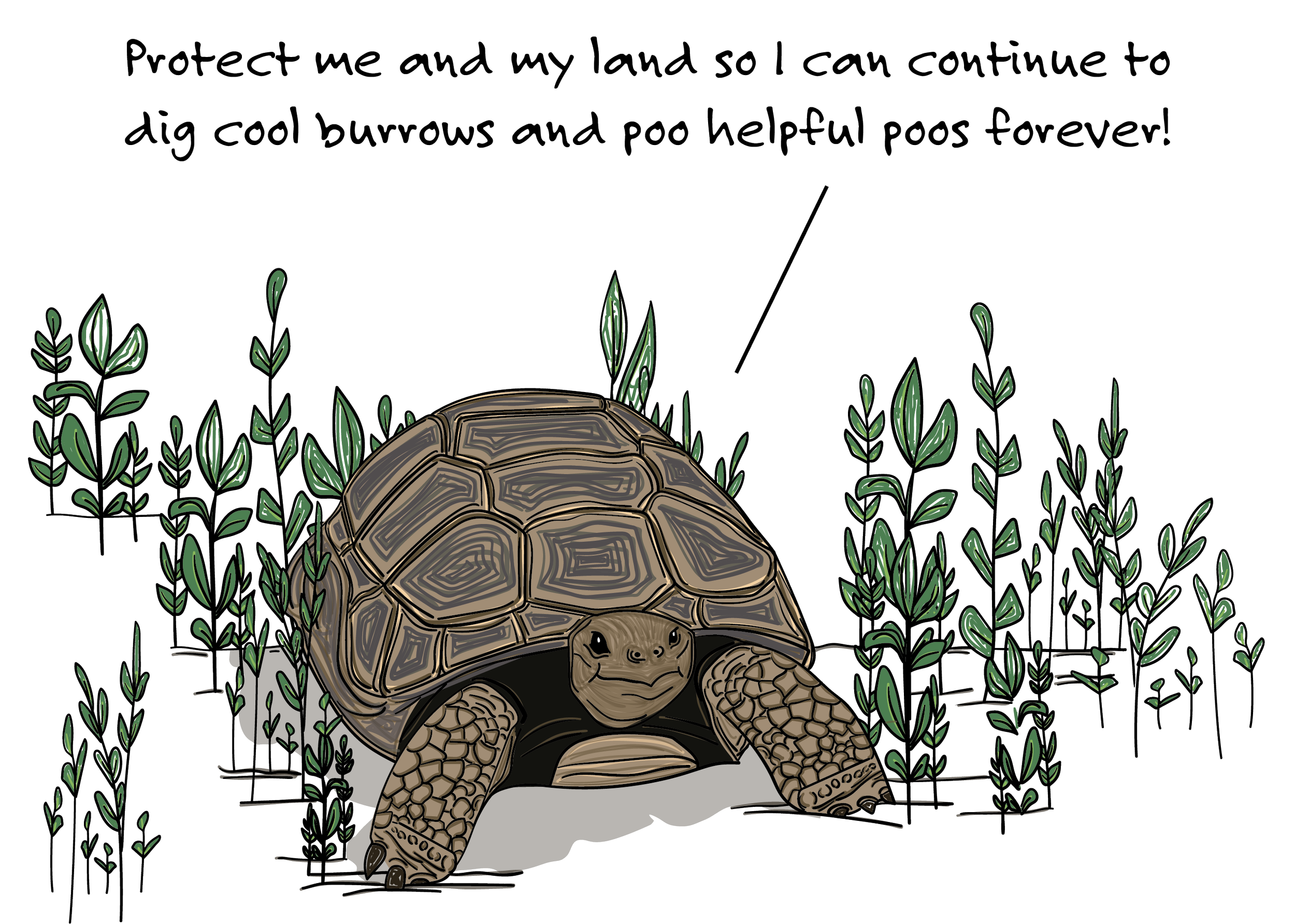 The burrows help shelter the tortoises and like, 350 other species from drought and fire and other environmental hazards. They dig a lot of burrows and don’t mind sharing with all those other squatter species, whether they still live there or not.