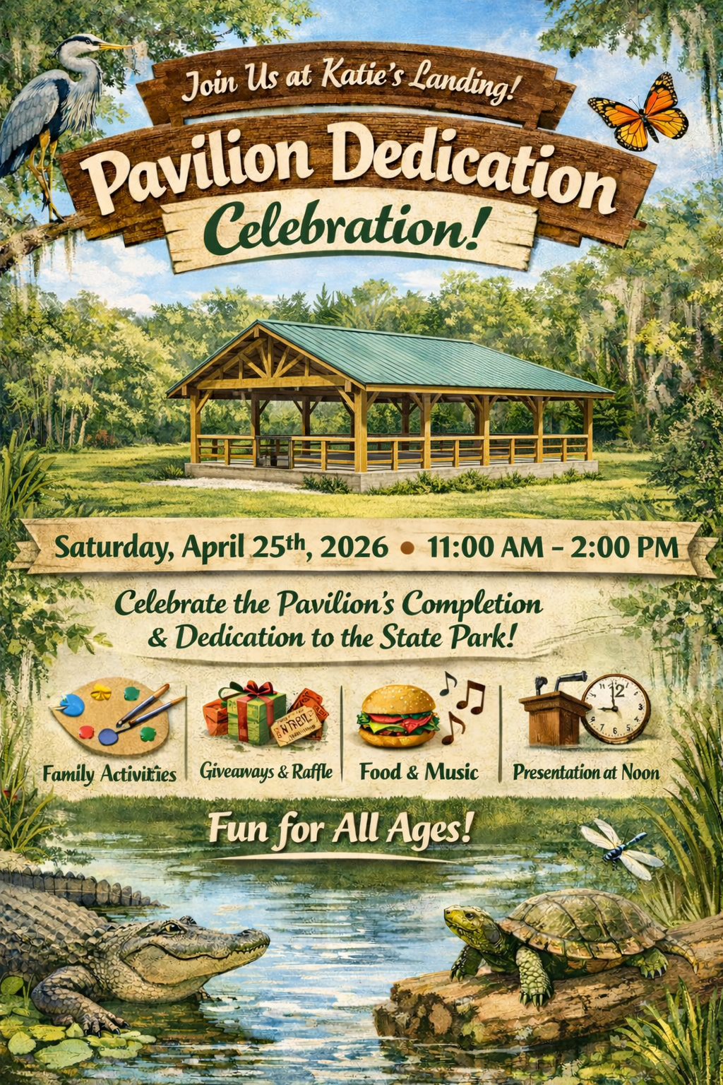 Description: After all the hard work and all the patience, we finally get to celebrate! Please join us for a joyful ceremony on April 25th from 11:00 a.m. to 2:00 p.m. at Katie’s Landing as we celebrate the pavilion’s completion and dedication to the State Park. There will be family-friendly activities, giveaways, a raffle, food, music, a presentation at noon, and loads of fun. More details coming soon, we hope to see you there!